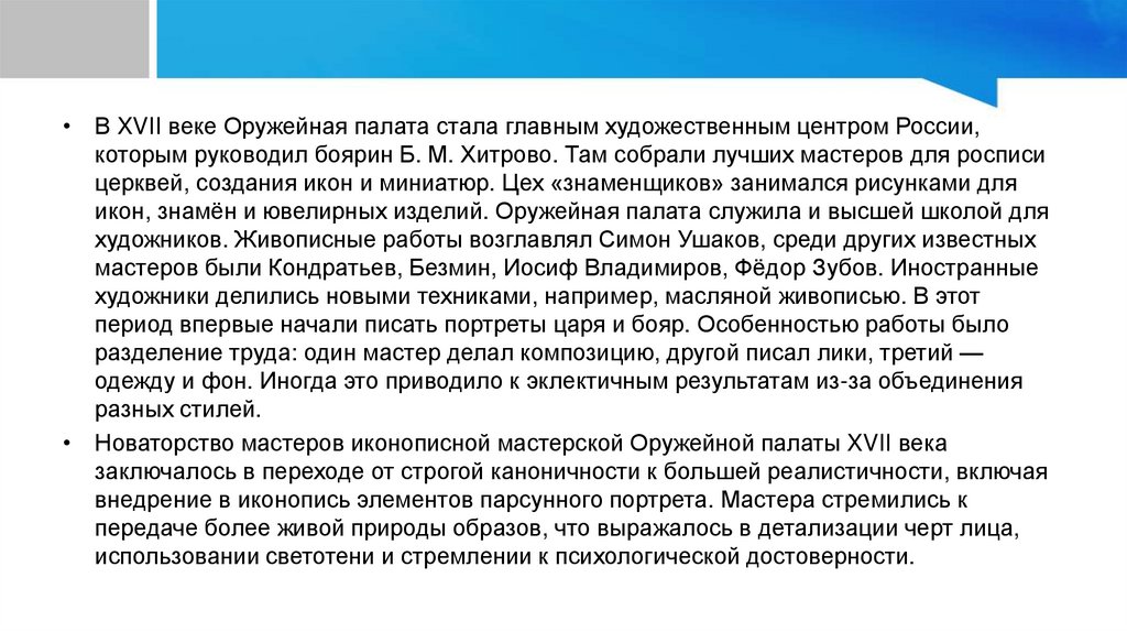 • В XVII веке Оружейная палата стала главным художественным центром России,которым руководил боярин Б. М. Хитрово. Там собрали лучших мастеров для росписи