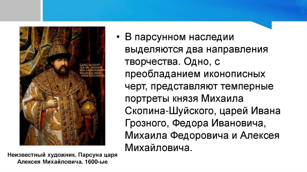 Парсунное письмо• Парсуна — это вид ранней русской портретной живописи, который