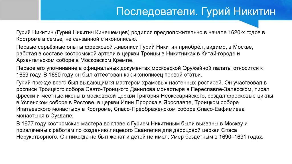 Последователи. Гурий НикитинГурий Никитин (Гурий Никитич Кинешемцев) родился предположительно в начале 1620-х годов в