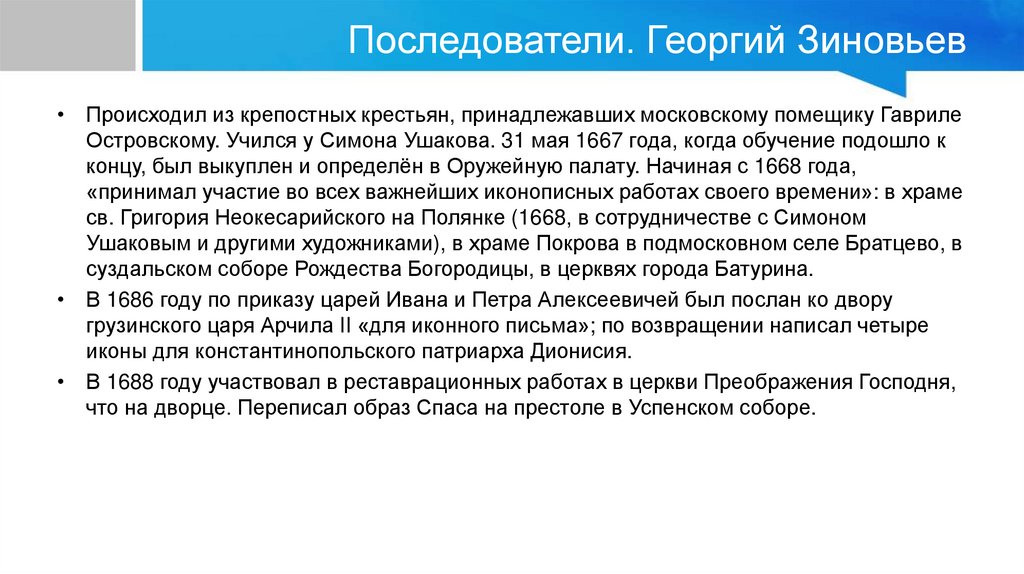 Последователи. Георгий Зиновьев• Происходил из крепостных крестьян, принадлежавших московскому помещику Гавриле