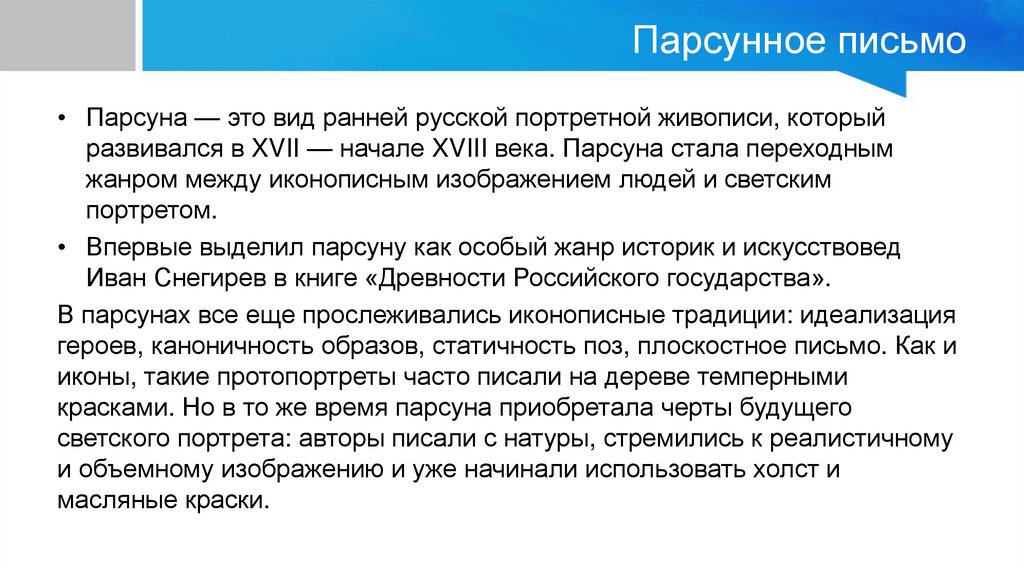 развивался в XVII — начале XVIII века. Парсуна стала переходным