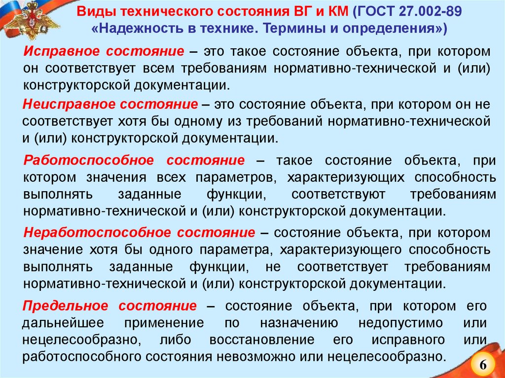 Виды технического состояния ВГ и КМ (ГОСТ 27.002-89«Надежность в технике. Термины и определения»)