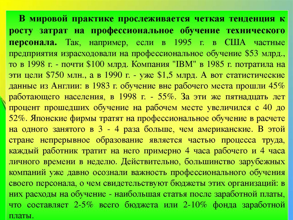 В мировой практике прослеживается четкая тенденция кросту затрат на профессиональное обучение технического