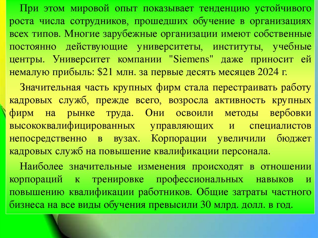При этом мировой опыт показывает тенденцию устойчивогороста числа сотрудников, прошедших обучение в организациях