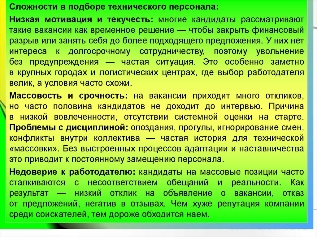Сложности в подборе технического персонала:Низкая мотивация и текучесть: многие кандидаты рассматривают