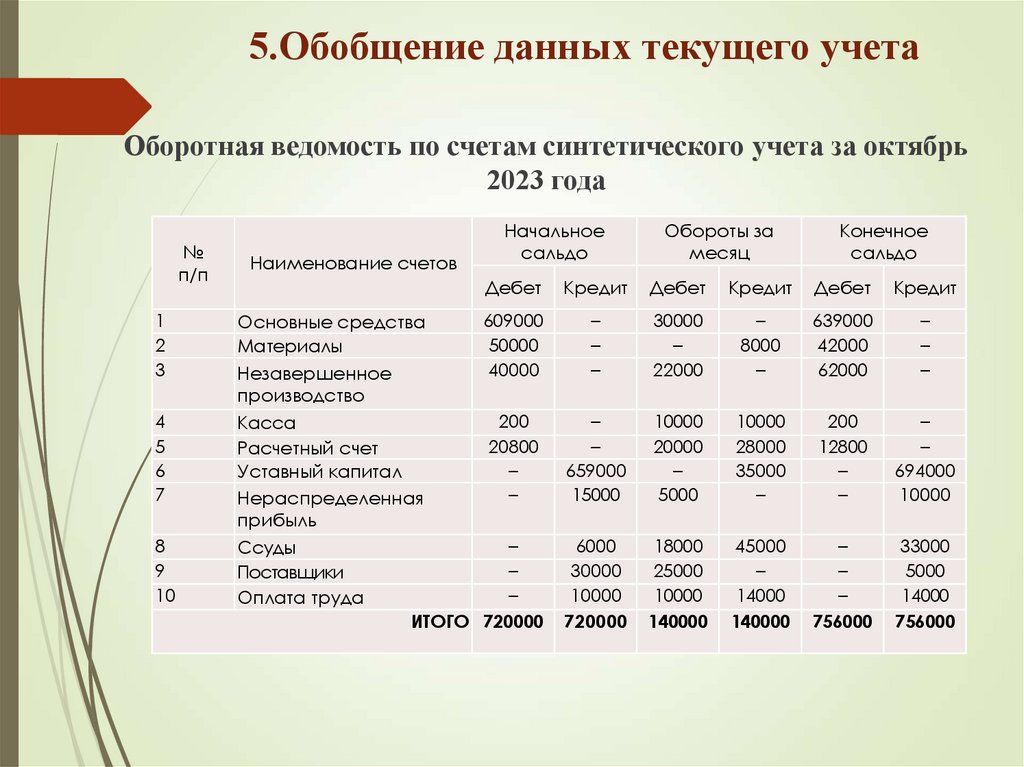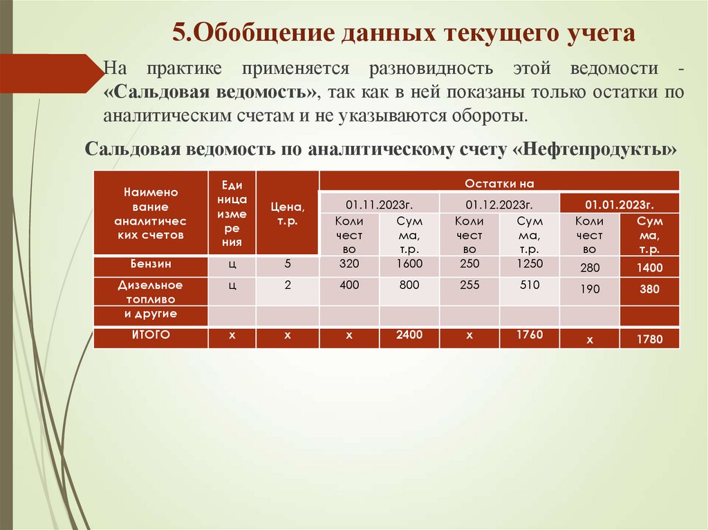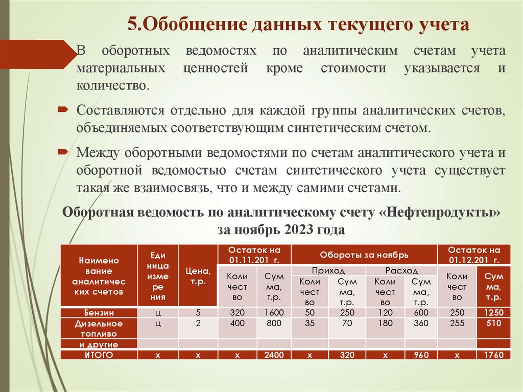 5.Обобщение данных текущего учетаНа практике применяется разновидность этой ведомости «Сальдовая ведомость», так как в ней показаны только остатки по