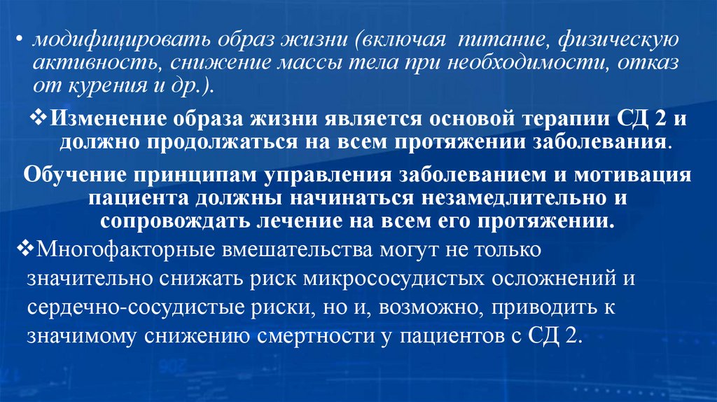 При лечении СД 2 необходимо придерживатьсястратегии многофакторного воздействия и, помимо