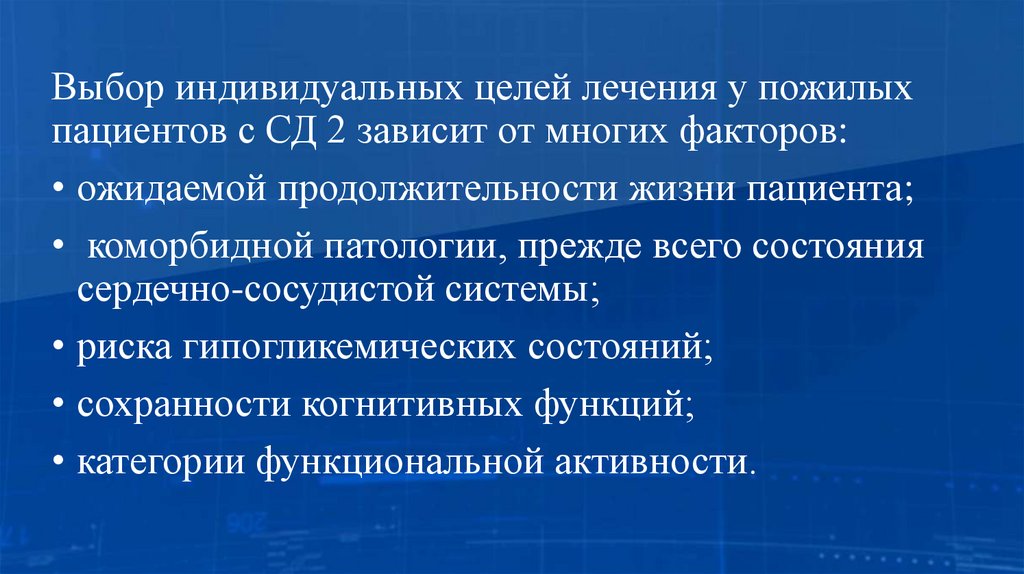 Выбор индивидуальных целей лечения у пожилыхпациентов с СД 2 зависит от многих факторов: