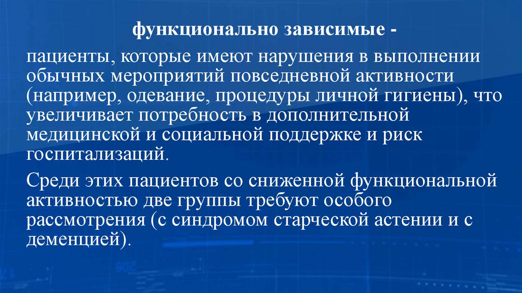 функционально зависимые пациенты, которые имеют нарушения в выполненииобычных мероприятий повседневной активности