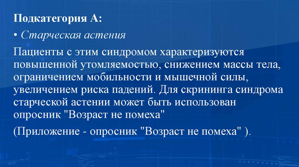Подкатегория А:• Старческая астения
