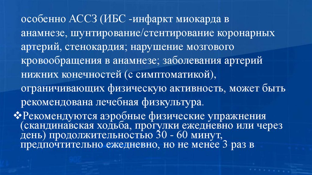особенно АССЗ (ИБС -инфаркт миокарда ванамнезе, шунтирование/стентирование коронарных