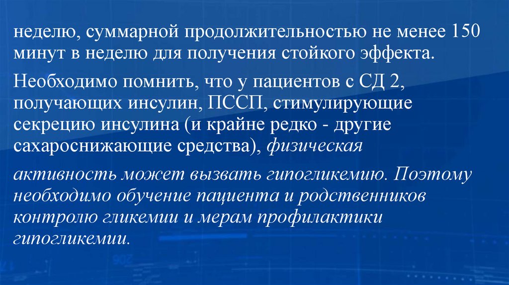 Рекомендуется регулярная физическая активностьпациентам с СД 2 для улучшения гликемического