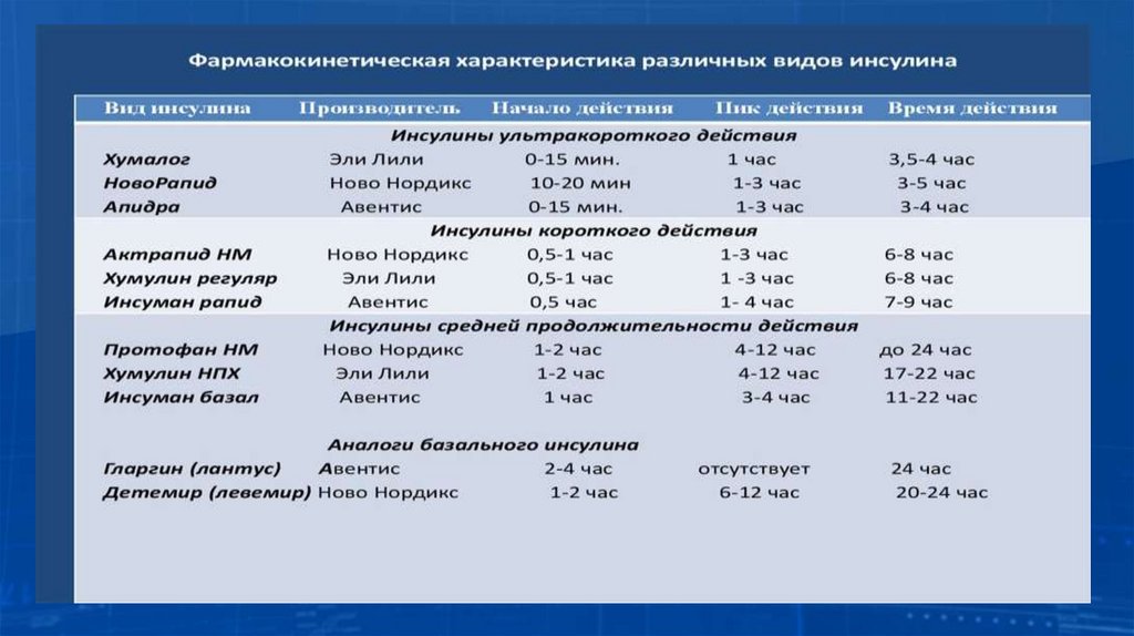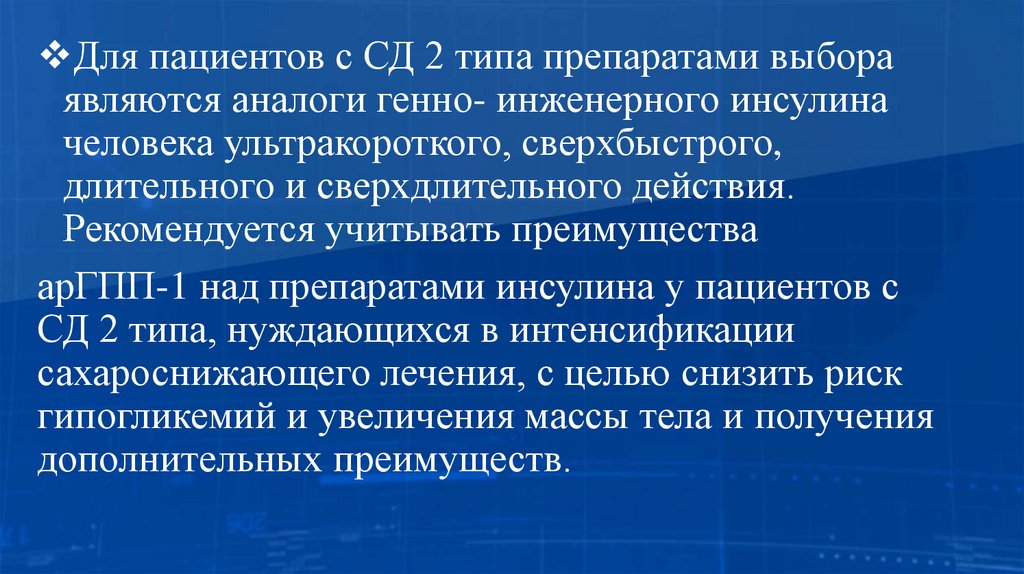 Для пациентов с СД 2 типа препаратами выбораявляются аналоги генно- инженерного инсулина