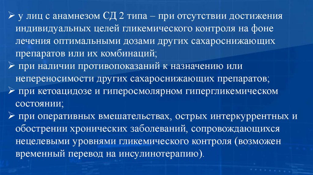 у лиц с анамнезом СД 2 типа – при отсутствии достиженияиндивидуальных целей гликемического контроля на фоне