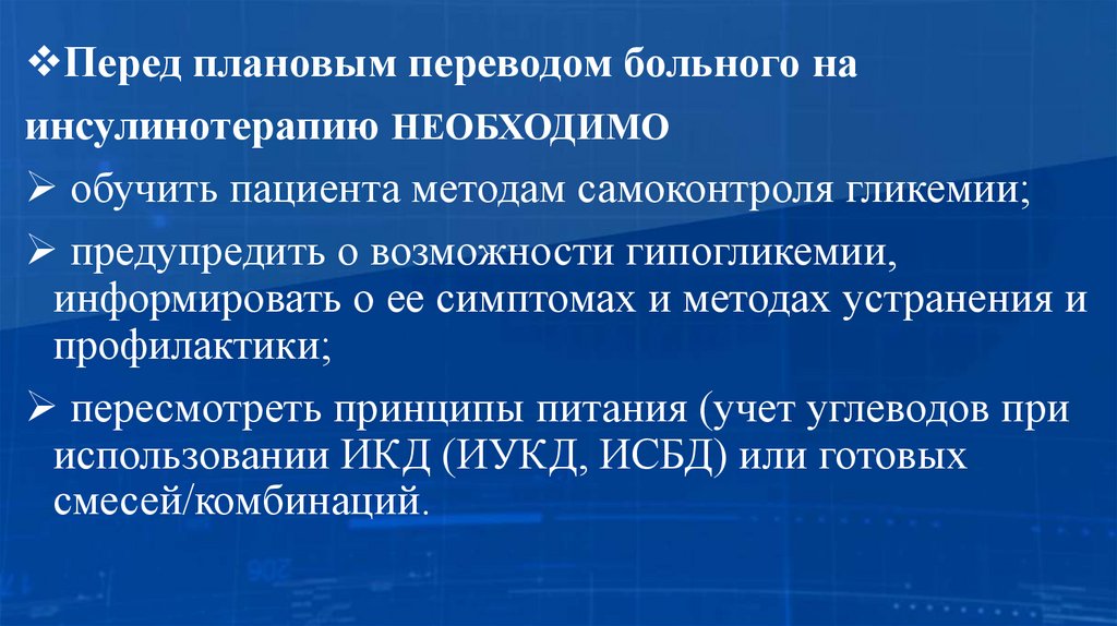 Перед плановым переводом больного наинсулинотерапию НЕОБХОДИМО