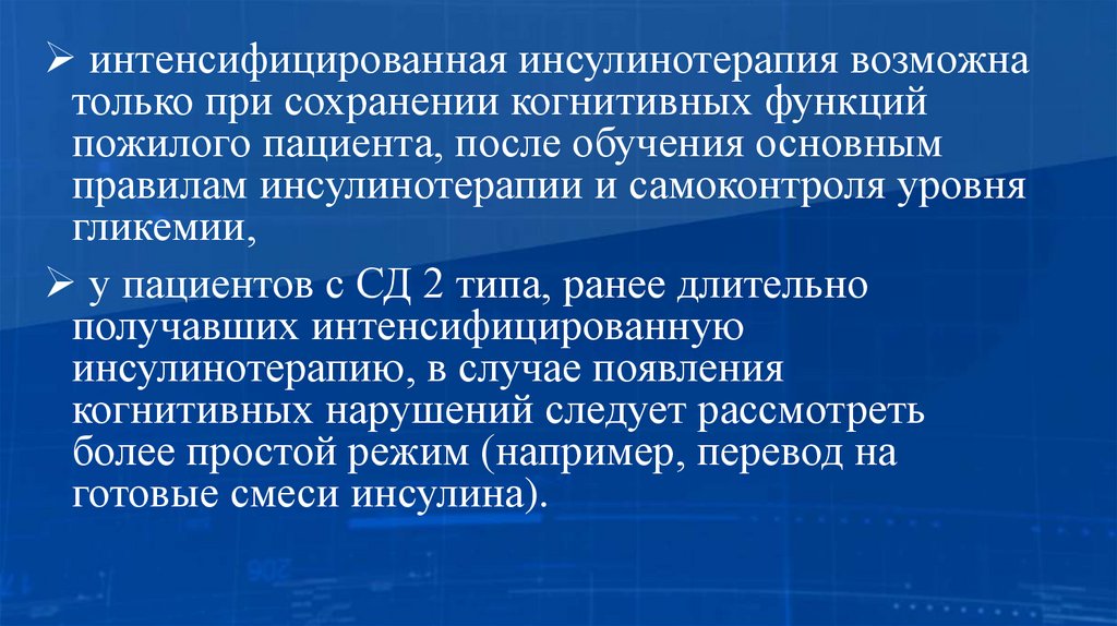 интенсифицированная инсулинотерапия возможнатолько при сохранении когнитивных функций