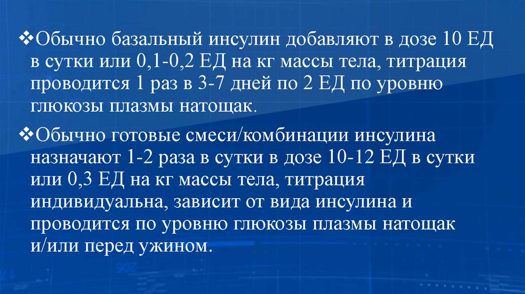 Обычно базальный инсулин добавляют в дозе 10 ЕДв сутки или 0,1-0,2 ЕД на кг массы тела, титрация