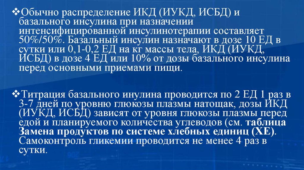 ИСБД) в дозе 4 ЕД или 10% от дозы базального инсулина