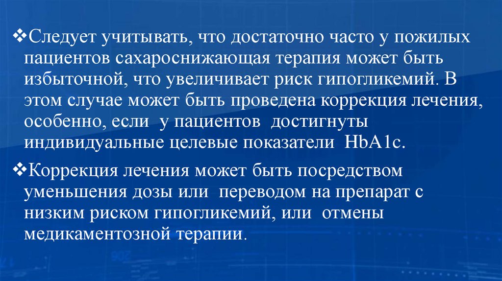 Следует учитывать, что достаточно часто у пожилыхпациентов сахароснижающая терапия может быть