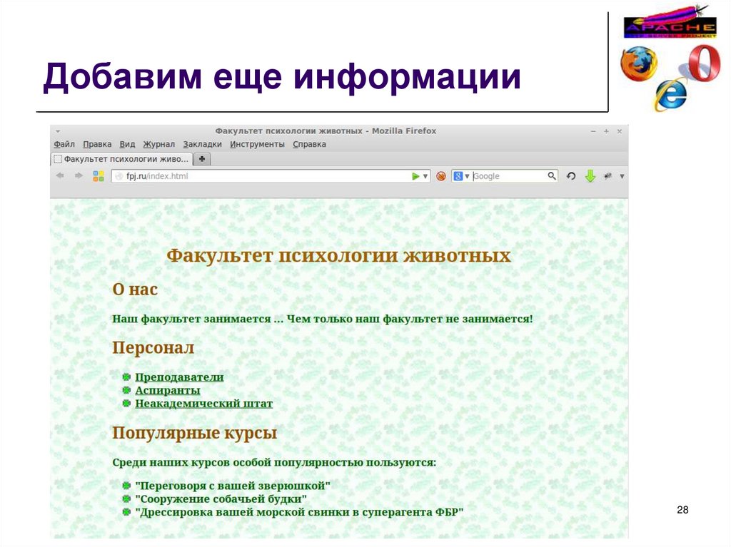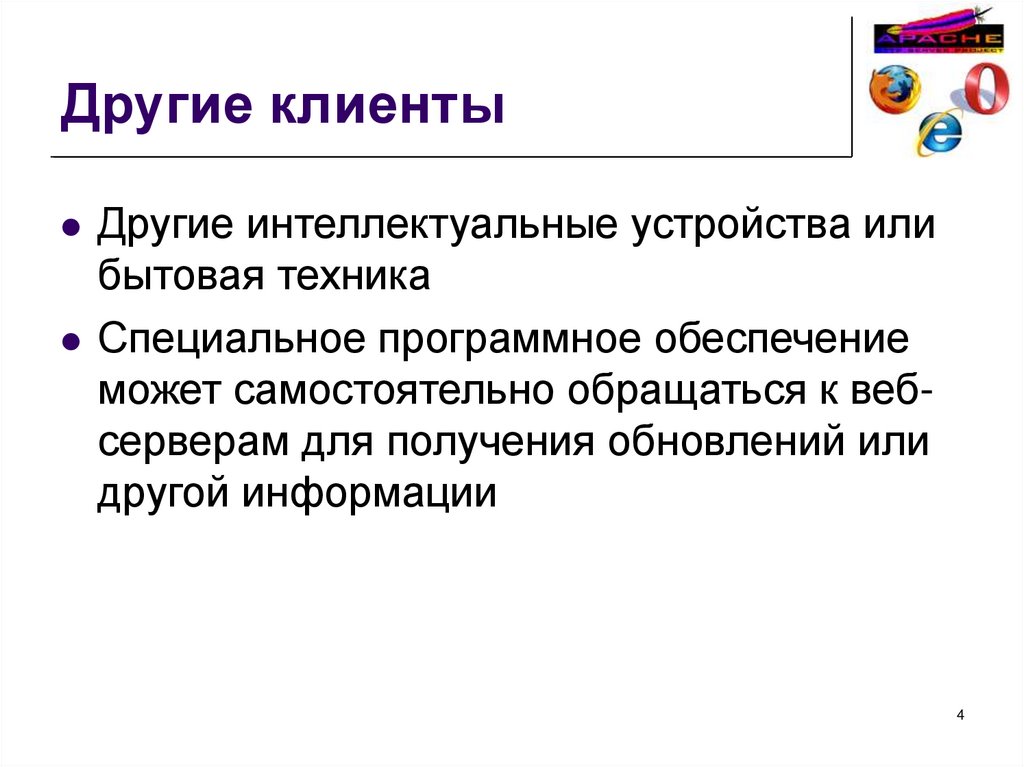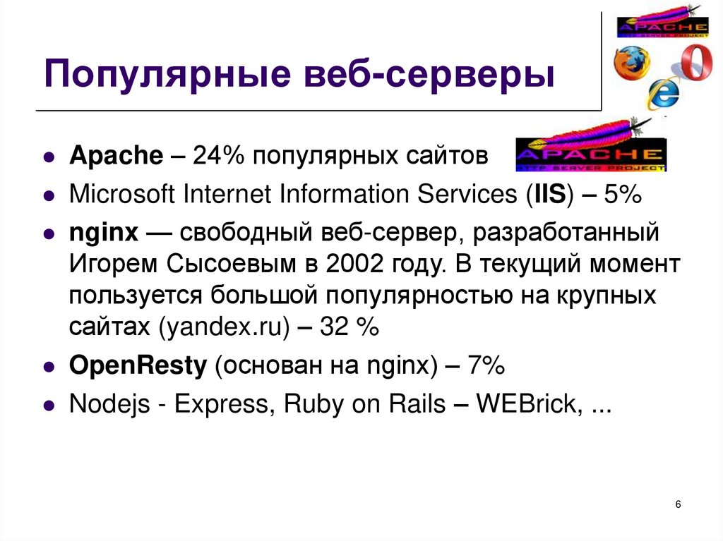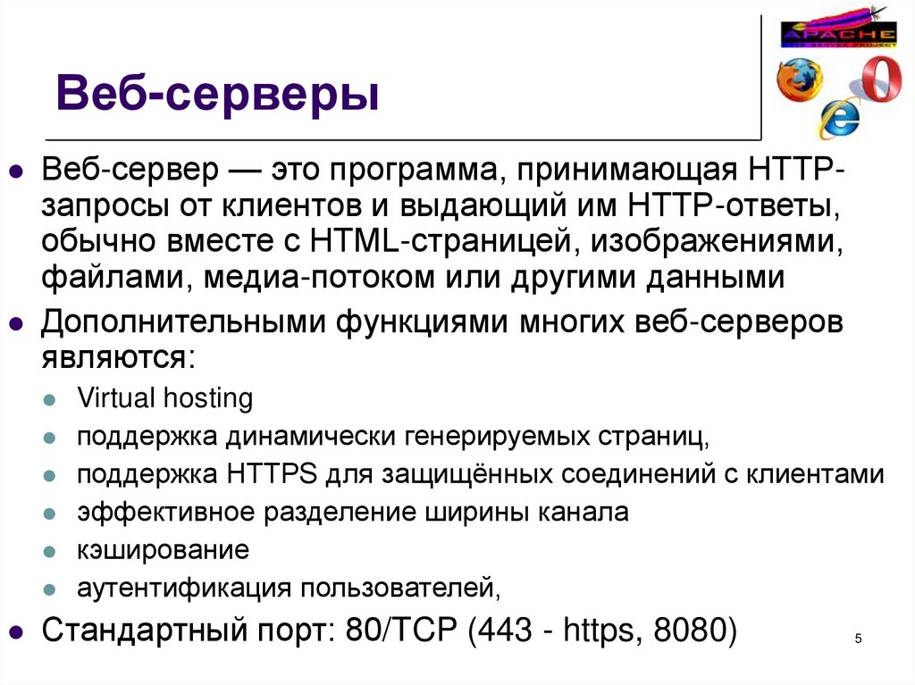 Веб-серверыВеб-сервер — это программа, принимающая HTTPзапросы от клиентов и выдающий им HTTP-ответы,