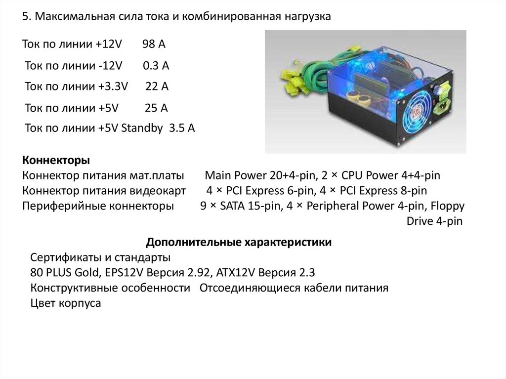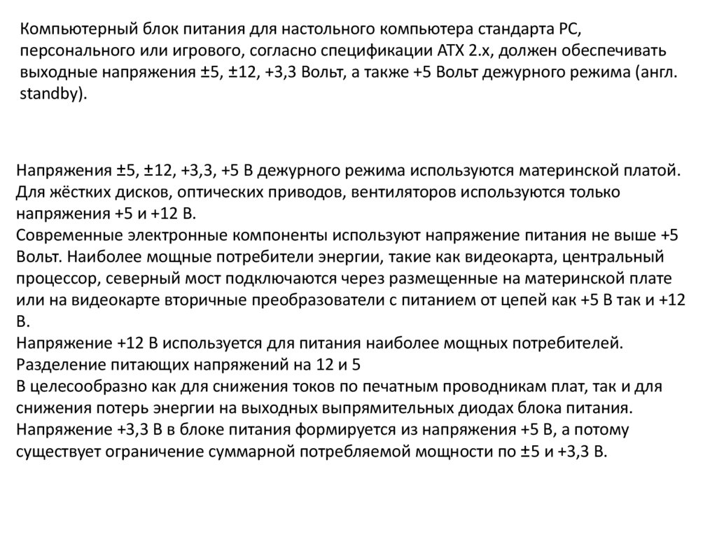 Компьютерный блок питания для настольного компьютера стандарта PC,персонального или игрового, согласно спецификации ATX 2.x, должен обеспечивать