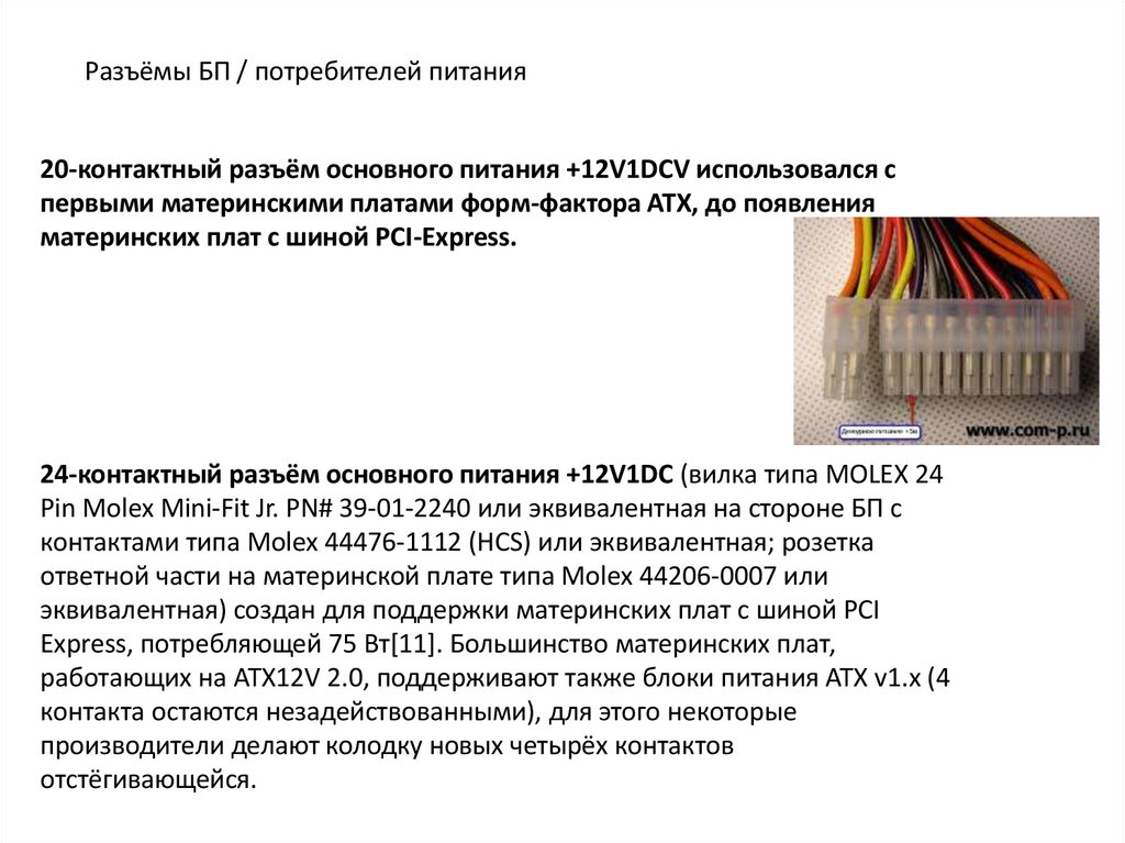 Разъёмы БП / потребителей питания20-контактный разъём основного питания +12V1DCV использовался с