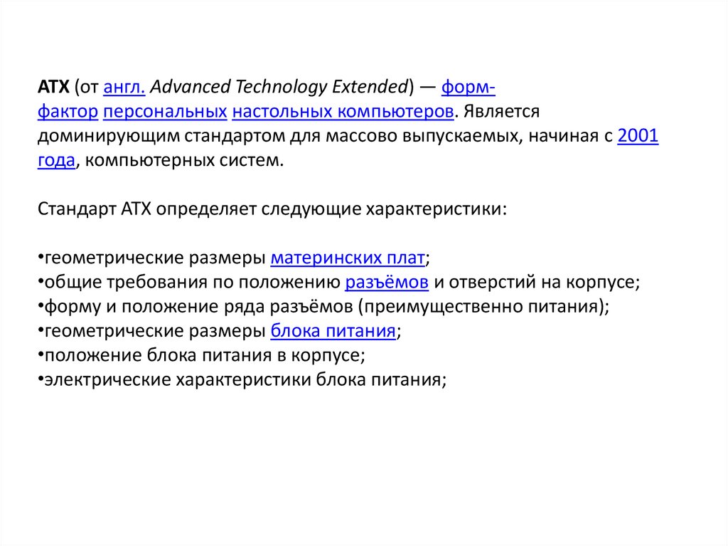 ATX (от англ. Advanced Technology Extended) — формфактор персональных настольных компьютеров. Являетсядоминирующим стандартом для массово выпускаемых, начиная с 2001