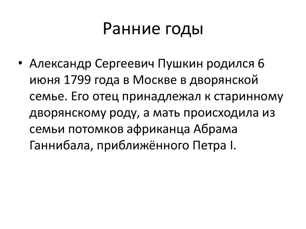 Ранние годы• Александр Сергеевич Пушкин родился 6