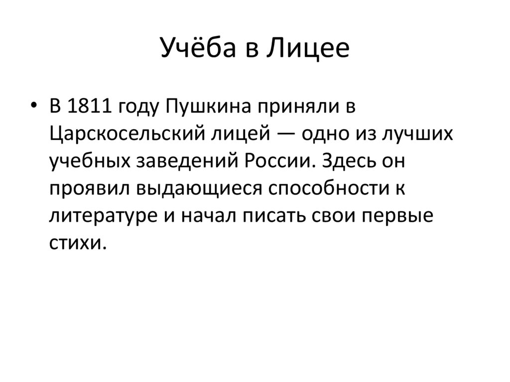 Учёба в Лицее• В 1811 году Пушкина приняли в