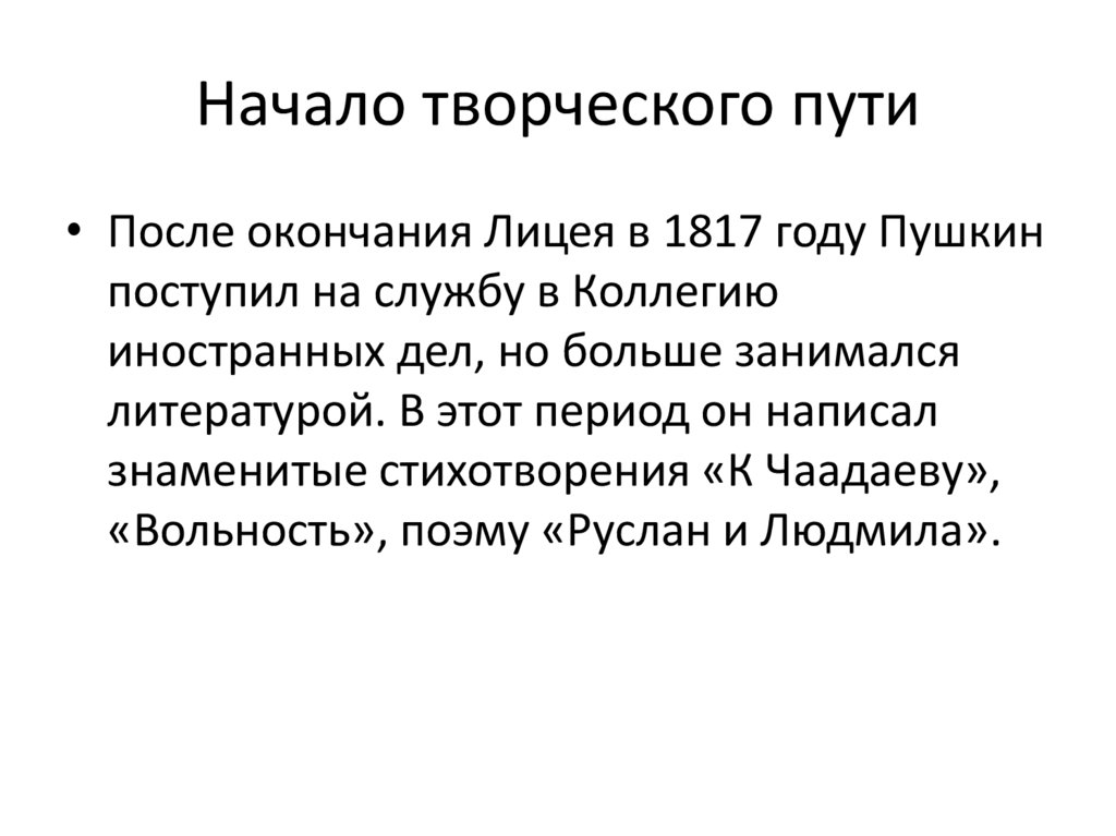 Начало творческого пути• После окончания Лицея в 1817 году Пушкин