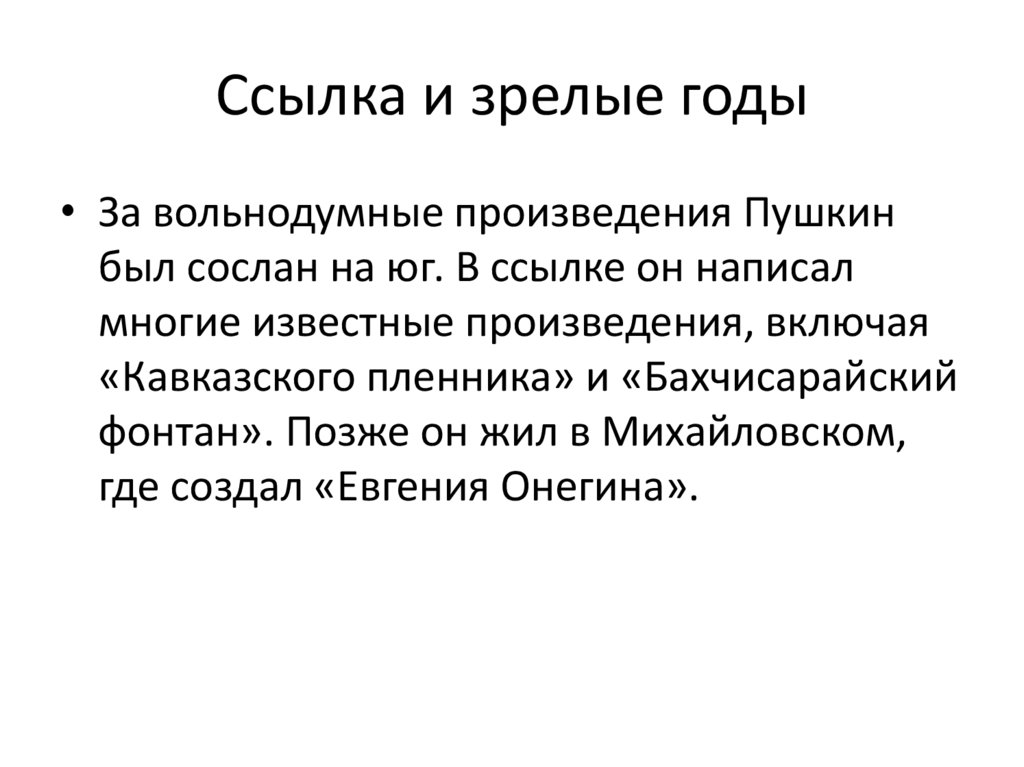 Ссылка и зрелые годы• За вольнодумные произведения Пушкин