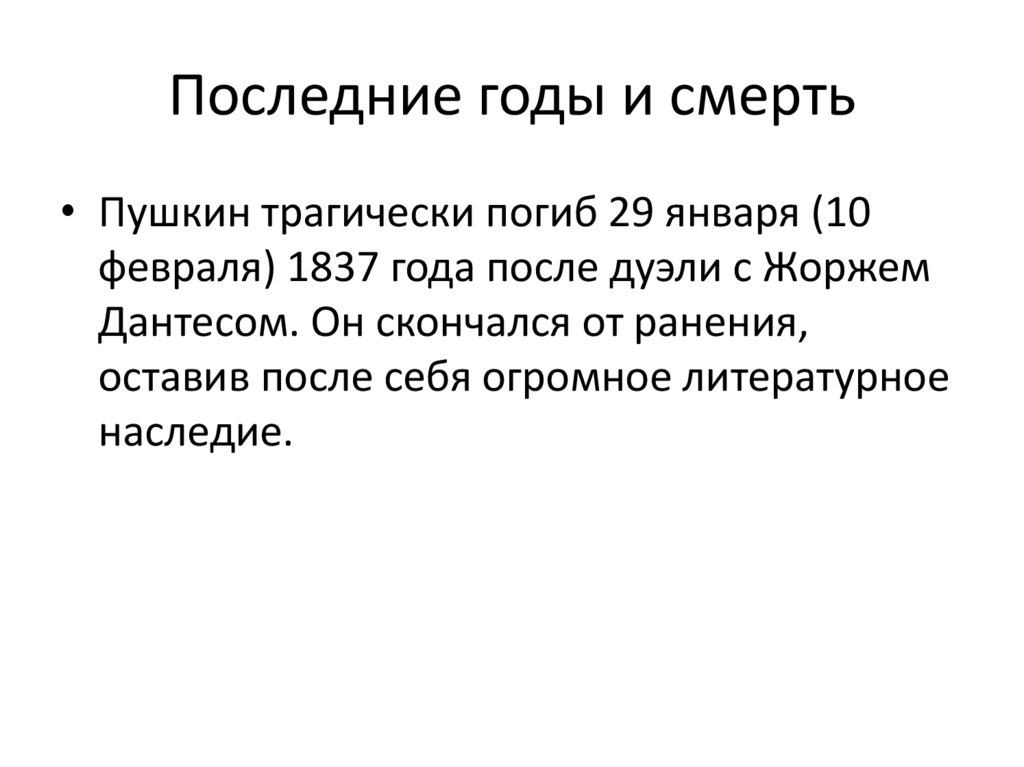 Последние годы и смерть• Пушкин трагически погиб 29 января (10