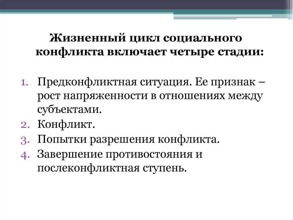 Жизненный цикл социальногоконфликта включает четыре стадии: