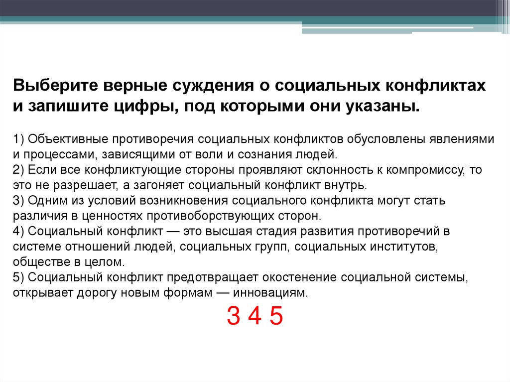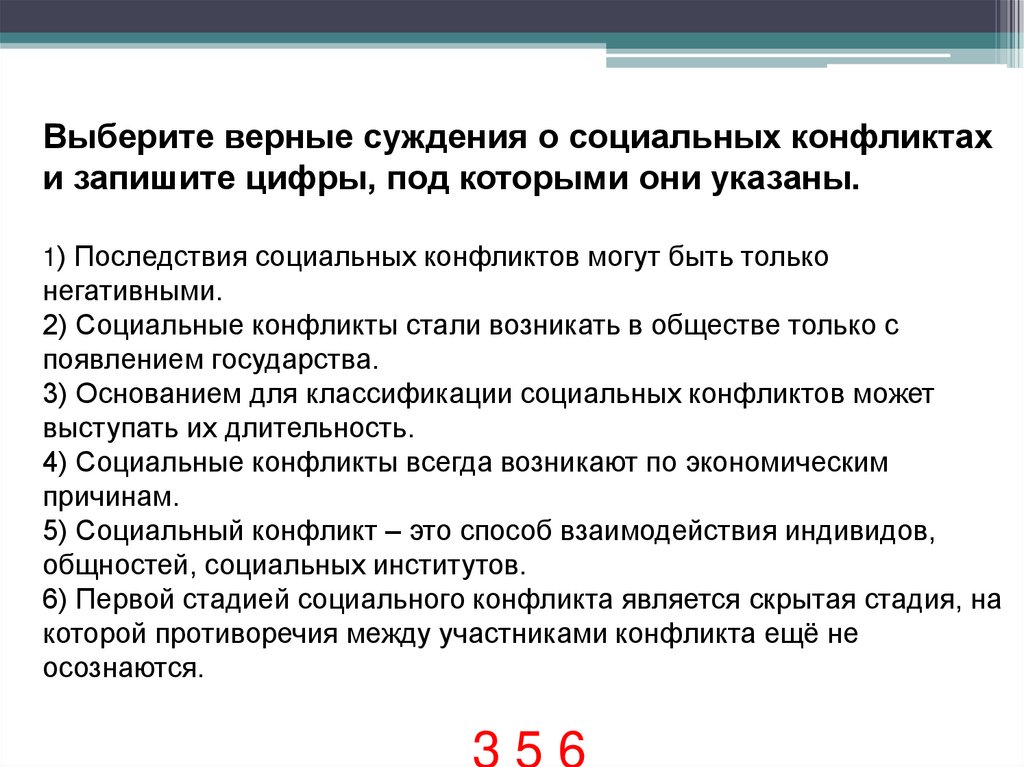 Выберите верные суждения о социальных конфликтахи запишите цифры, под которыми они указаны.