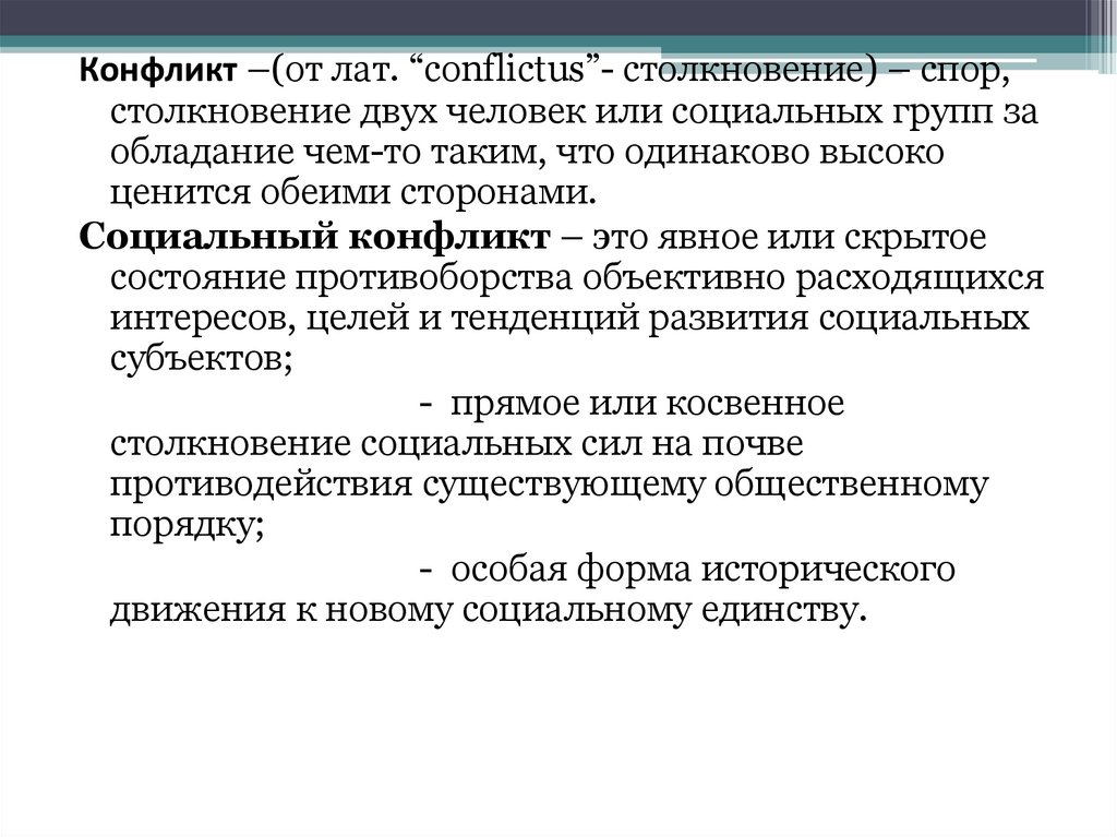 Конфликт –(от лат. “conflictus”- столкновение) – спор,столкновение двух человек или социальных групп за