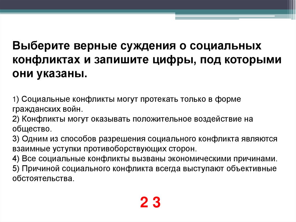 Выберите верные суждения о социальныхконфликтах и запишите цифры, под которыми