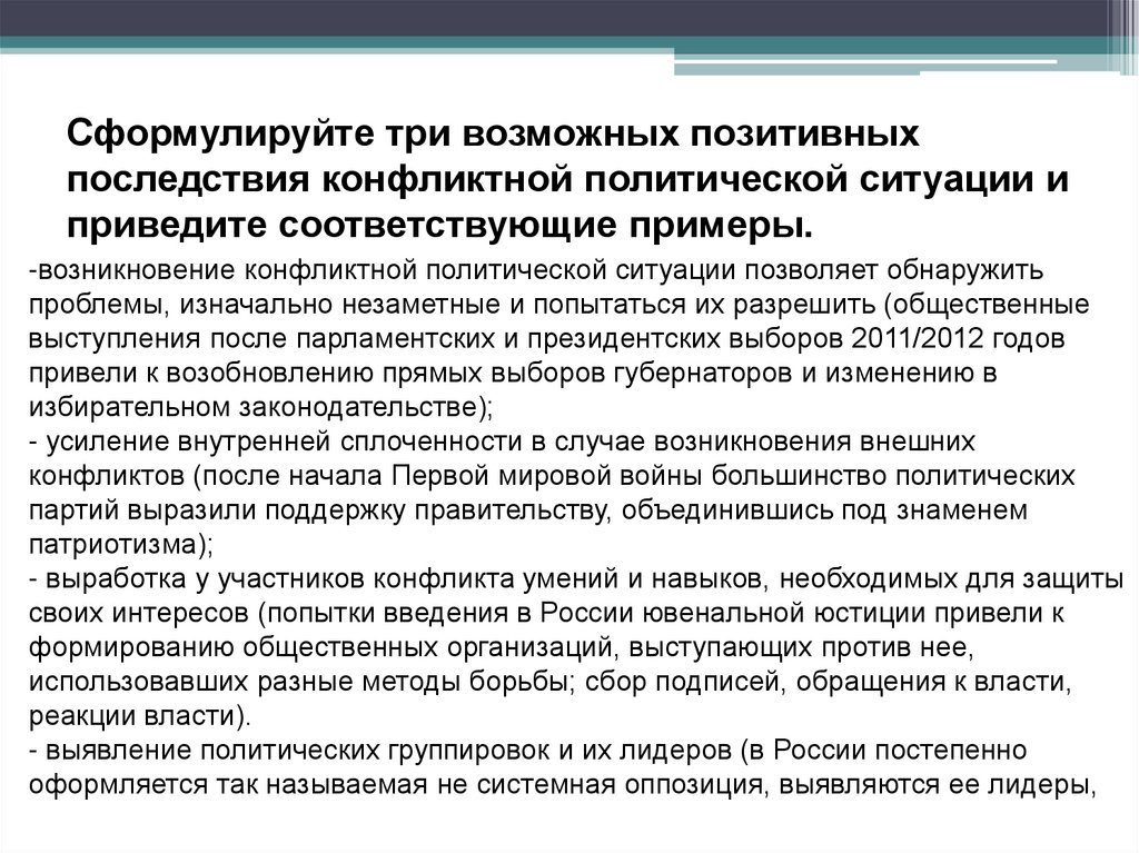 Сформулируйте три возможных позитивныхпоследствия конфликтной политической ситуации и