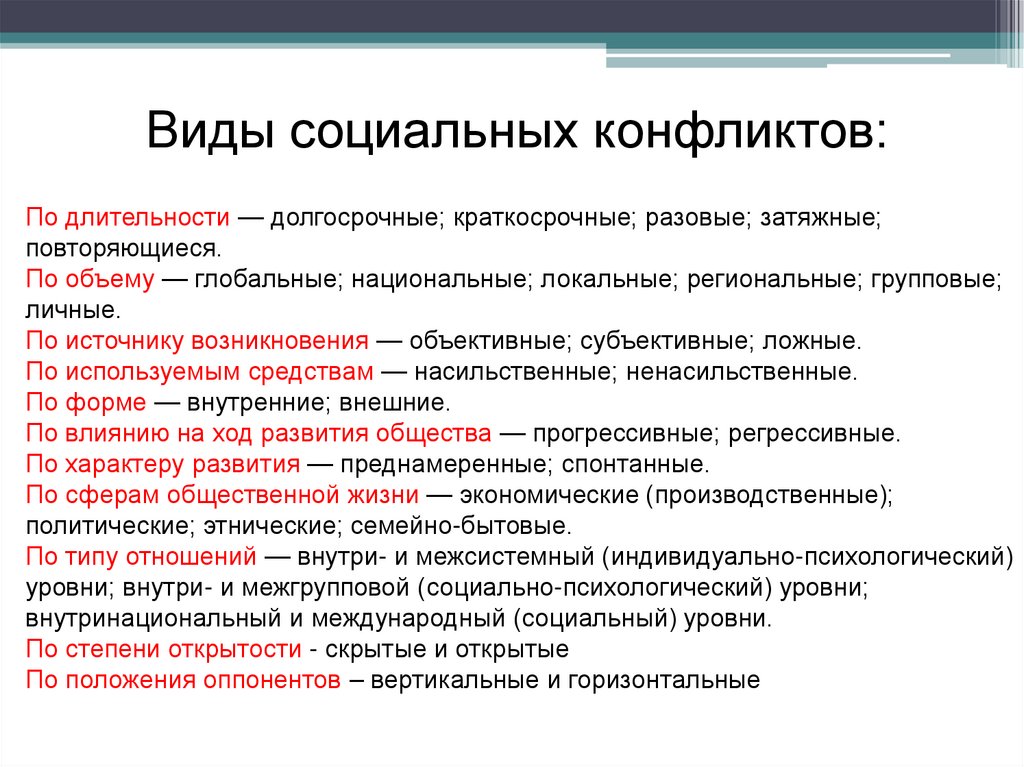 Виды социальных конфликтов:По длительности — долгосрочные; краткосрочные; разовые; затяжные;