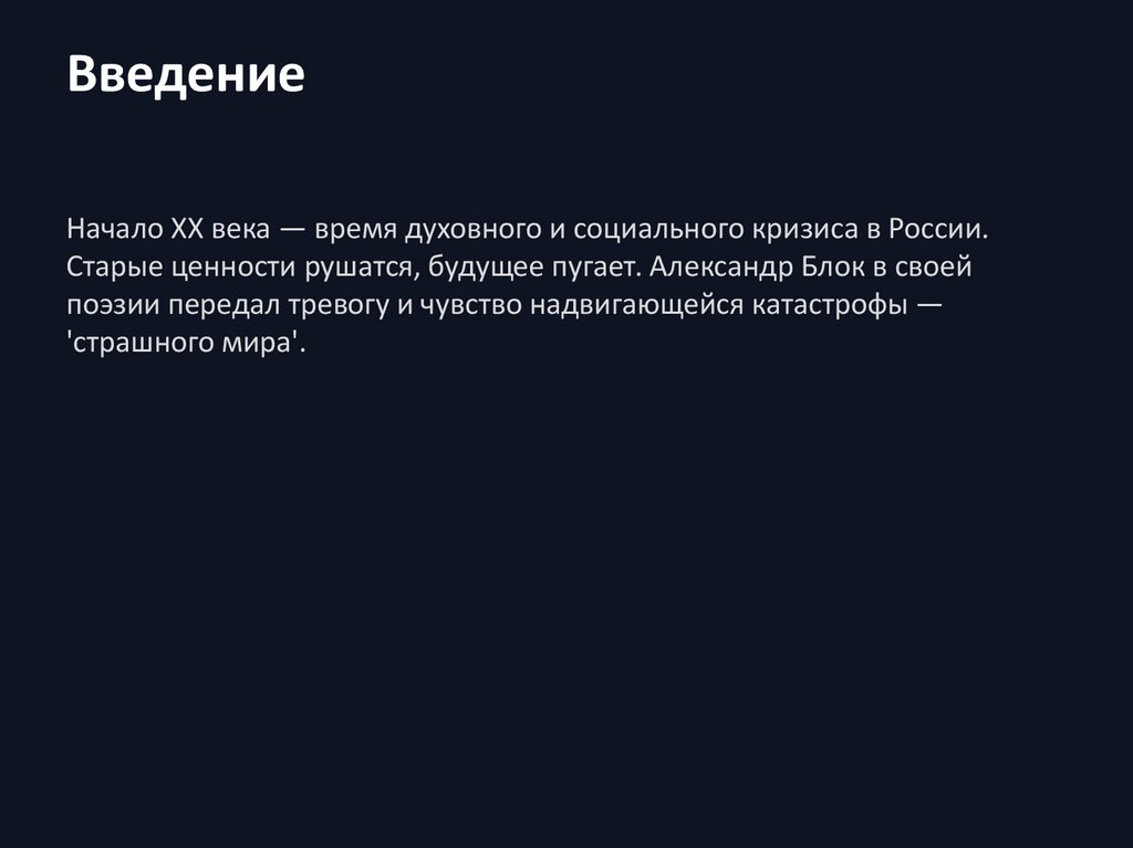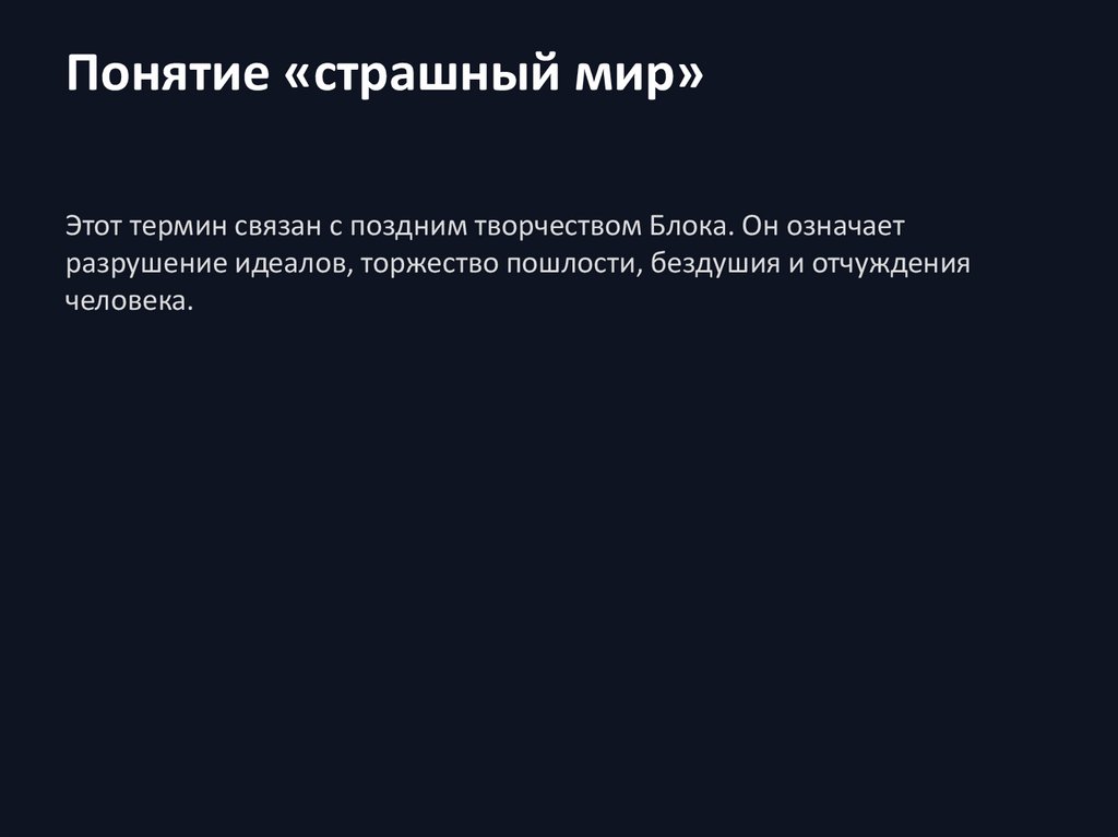 Понятие «страшный мир»Этот термин связан с поздним творчеством Блока. Он означает