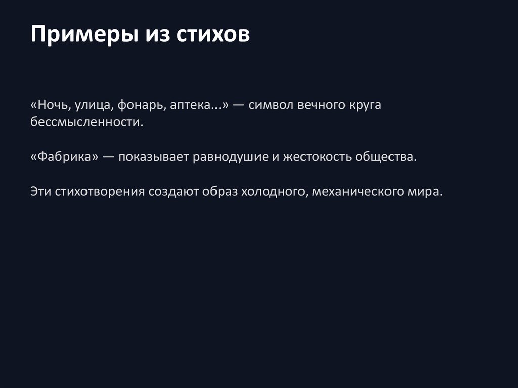 Примеры из стихов«Ночь, улица, фонарь, аптека...» — символ вечного круга