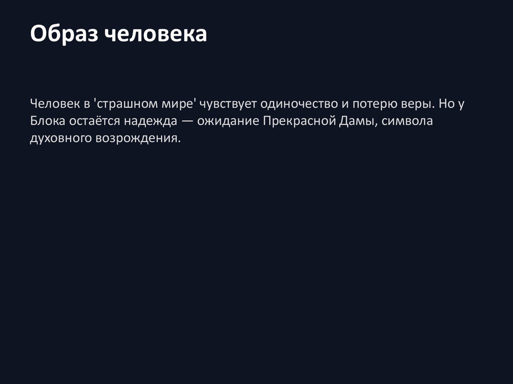Образ человекаЧеловек в 'страшном мире' чувствует одиночество и потерю веры. Но у