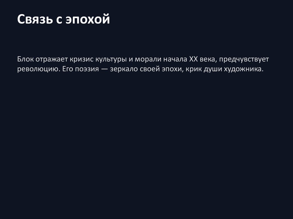 Связь с эпохойБлок отражает кризис культуры и морали начала XX века, предчувствует