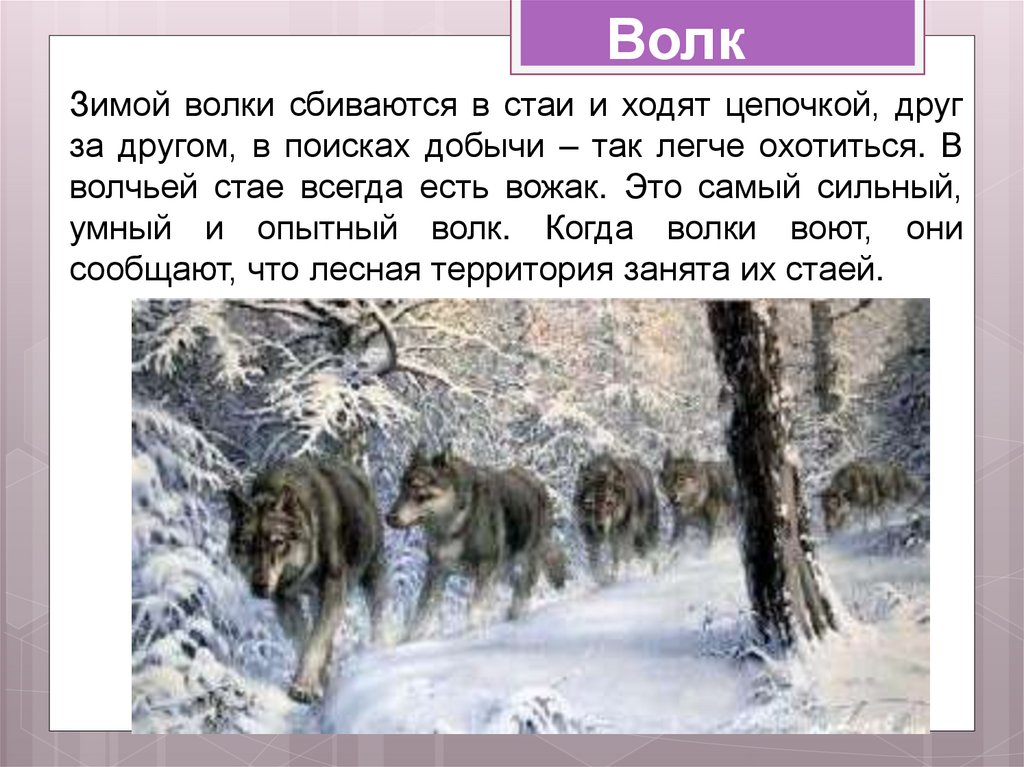 ВолкЗимой волки сбиваются в стаи и ходят цепочкой, друг