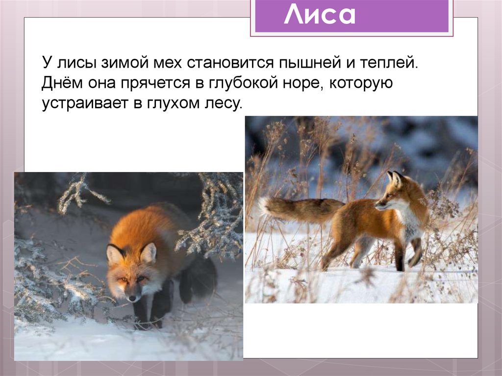ЛисаУ лисы зимой мех становится пышней и теплей.