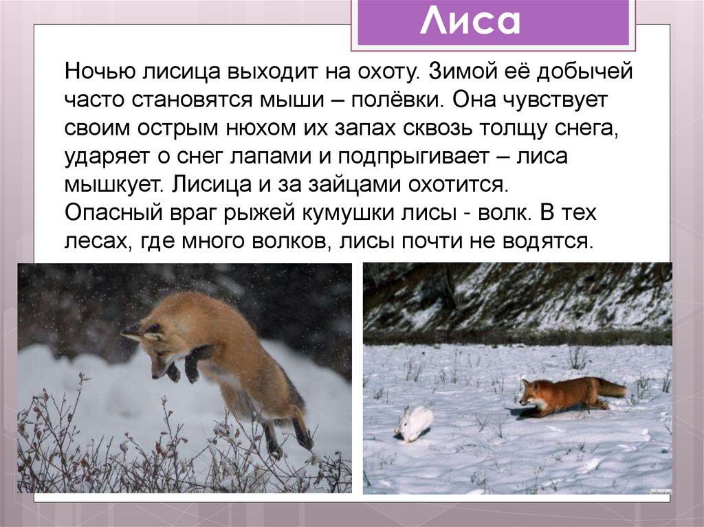 Ночью лисица выходит на охоту. Зимой её добычейчасто становятся мыши – полёвки. Она чувствует