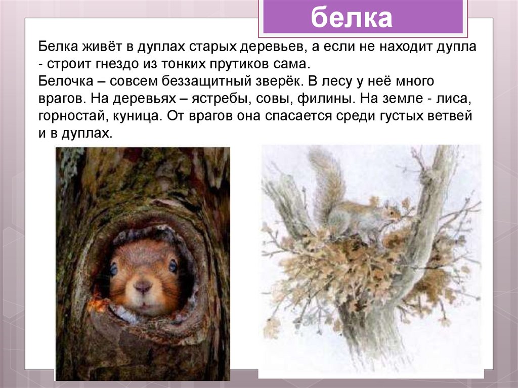 белкаБелка живёт в дуплах старых деревьев, а если не находит дупла
