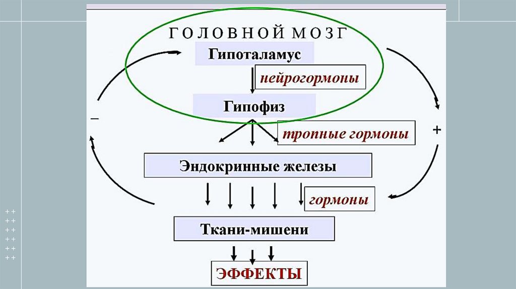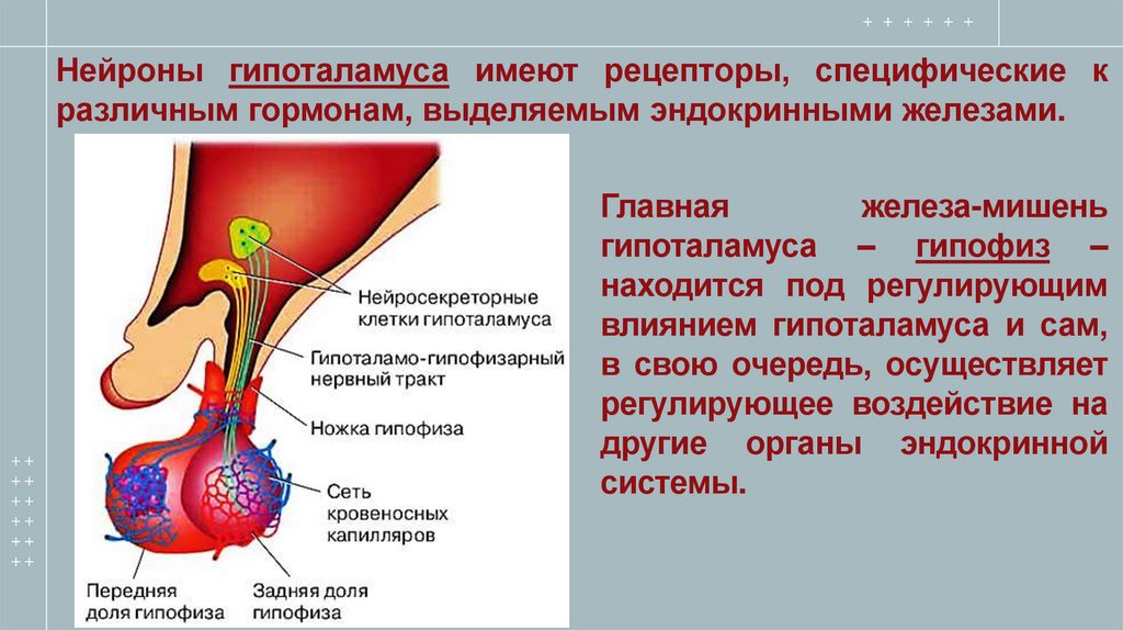 Нейроны гипоталамуса имеют рецепторы, специфические кразличным гормонам, выделяемым эндокринными железами.