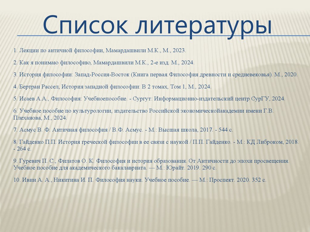 Список литературы1. Лекции по античной философии, Мамардашвили М.К., М., 2023.