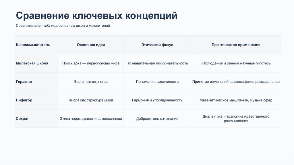 Сравнение ключевых концепцийСравнительная таблица основных школ и мыслителей