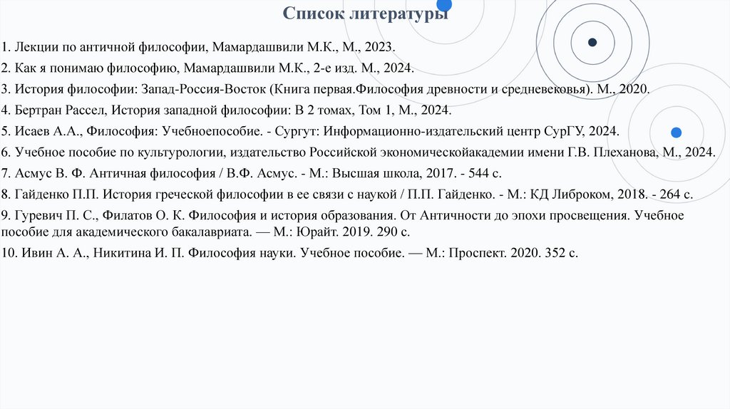 Список литературы1. Лекции по античной философии, Мамардашвили М.К., М., 2023.